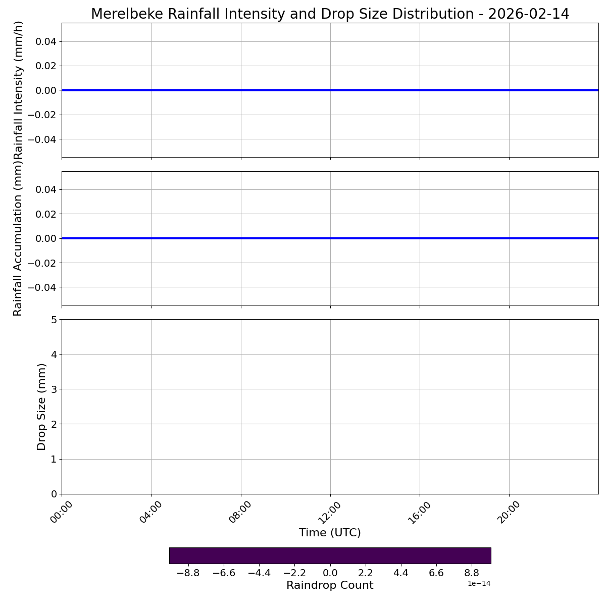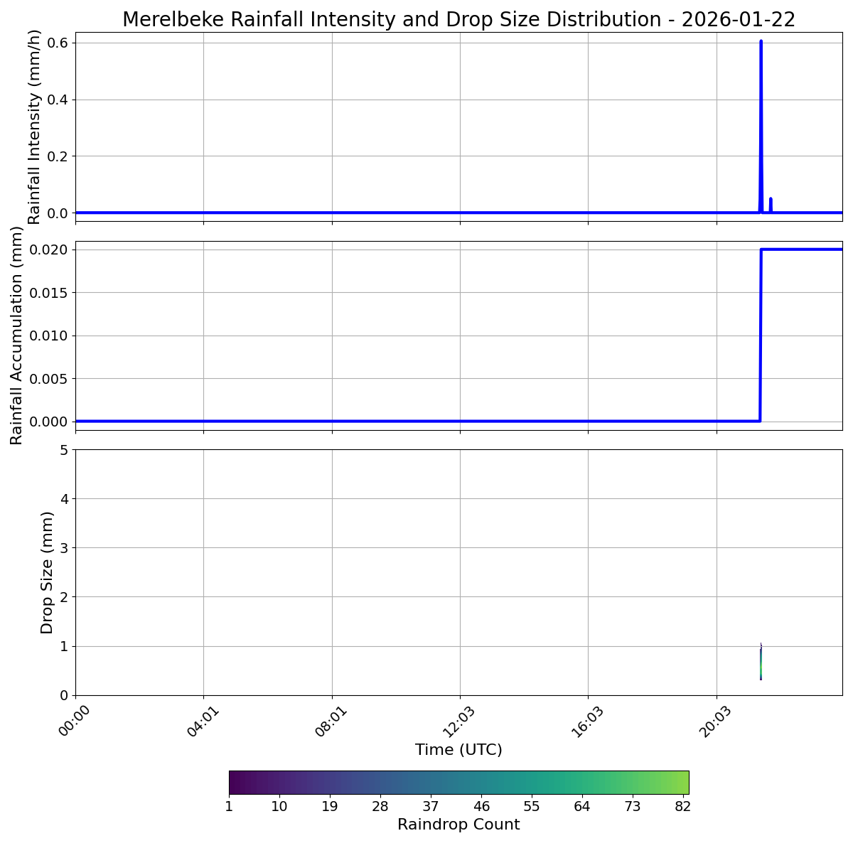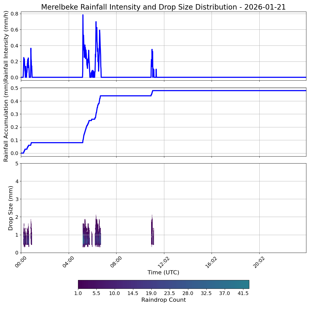 The "Climate & Earth" team's disdrometer setup and processing backend produces daily updated graphs of precipitation measurements from the disdrometer and rain gauge at ILVO, Merelbeke.