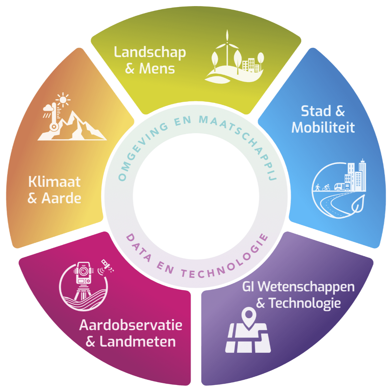 Het onderzoek Geografie / Geomatica binnen de vakgroep Geografie is gebaseerd op twee fundamentele onderzoekspijlers: Omgeving en Maatschappij en Data en Technologie.