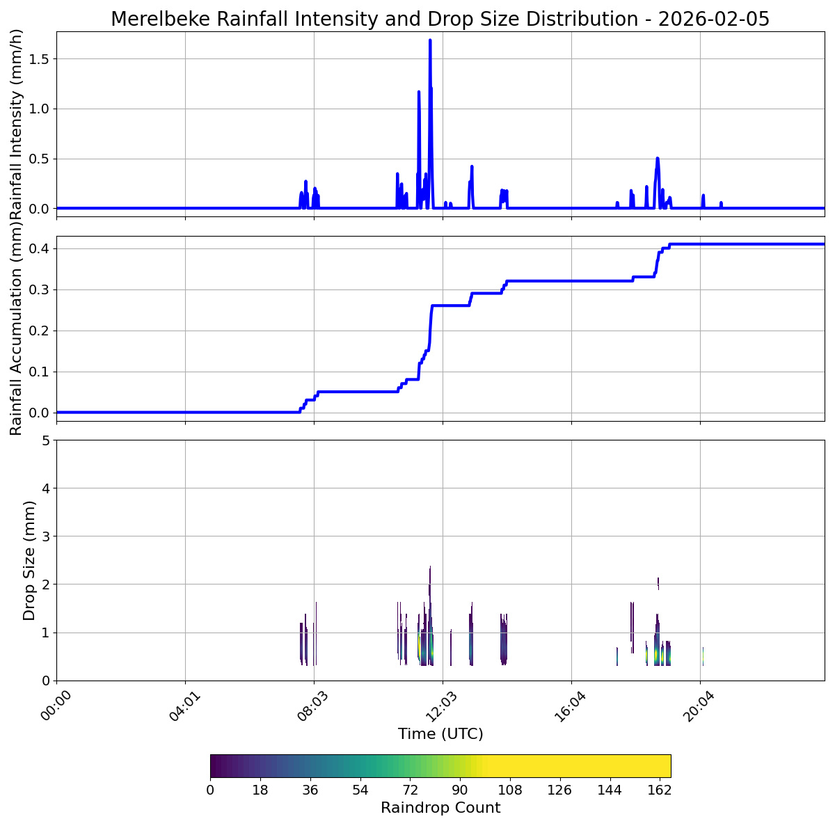 The "Climate & Earth" team's disdrometer setup and processing backend produces daily updated graphs of precipitation measurements from the disdrometer and rain gauge at ILVO, Merelbeke.